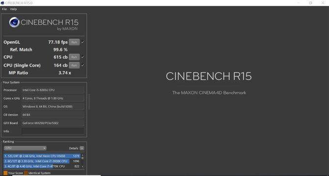 然后我們看看i5-8265U在這款筆記本上的表現,CINEBENCH R15在多核任務的最終得分達到了615cb,單核164cb。而國際象棋多核計算能力也達到了11536的水平。在輕薄商務本的應用方面,這樣的得分表現已經意味著可以應對更多的圖形圖像、甚至是視頻處理,尤其是多任務應用方面,幾乎沒有瓶頸。