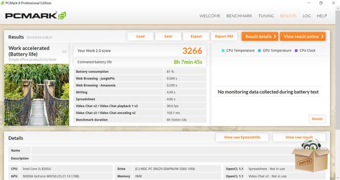 這款筆記本內置三芯45Wh高密度電池,容量為3750mAh。我們檢測的方式是首先將系統設置為“更長的續航”模式下,然后通過PCMARK8 Work模式檢測,最終結果為8小時7分,還剩余20%未關機。這樣的成績,可以說比同類產品要好上很多,甚至比其他容量更大的電池續航時間還要更長。
