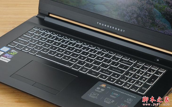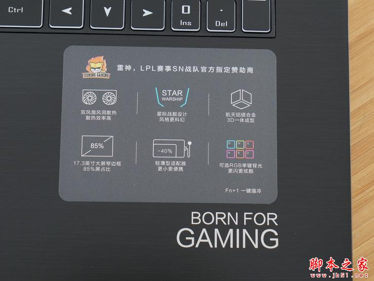右側掌托上面的貼紙介紹了這款大屏游戲本的一些突出的設計亮點。例如,雙風扇強勁散熱、85%的屏占比、超薄尺寸的電源適配器以及Fn+1一鍵強冷散熱等等。