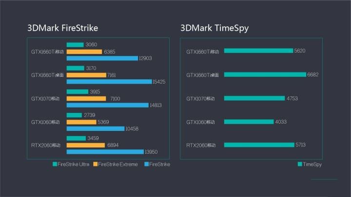 通過3DMARK的跑分對比可以看出,較桌面版的GTX 1660 Ti,移動版的整體性能大概有15%左右的下降,和移動版GTX 1060相比,各項跑分均大幅領先,整體有約30%的性能提升。而在和移動版的GTX 1070進行對比時,我們發現在基于DX11的Fire strike項目中GTX 1660 Ti整體要落后GTX 1070 15%左右。而在基于DX12的Time Spy的跑分中,GTX 1660 Ti已經實現的超越,所以在越來越多的支持DX12的新游戲中GTX 1660 Ti應該能夠追平甚至超越GTX 1070。當然這些均是我們根據跑分的理論分析,真正能反映性能的還得看實際游戲測試。