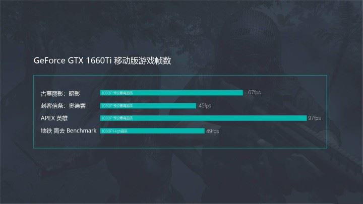 通過游戲幀數對比也可以看出,移動版的GTX 1660Ti遠超GTX 1060,領先幅度30%以上,而且已經比較接近GTX 1070了,尤其是在支持DX12的游戲中,差距在10%之內,綜合大部分游戲來看,整體差距基本在10%左右。這也和3Dmark跑分大體吻合,而且我們也發現它和目前的移動版RTX 2060無限接近。