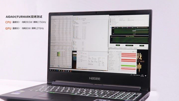 在室溫25℃左右,進行的AIDA64和Furmark雙烤測試中可以看到,CPU溫度80℃,功耗39.5W,頻率為略高于基礎頻率的2.75GHz左右(基礎頻率2.6Ghz),GPU溫度同樣為80℃,功耗80W,頻率1.27GHz左右,性能釋放正常。