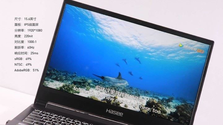 屏幕素質方面,可能由于控制價格的原因,這款產品沒有跟進144Hz和高色域。其搭載的是一塊15.6英寸的IPS鏡面屏,分辨率1920*1080,亮度220nit,對比度1000:1,刷新率60Hz,響應時間25ms。通過Spyder 5測試,其sRGB色域為69%,NTSC色域為49%,AdobeRGB為51%,這樣的屏幕素質在2019年的游戲本市場基本就處于下游了。