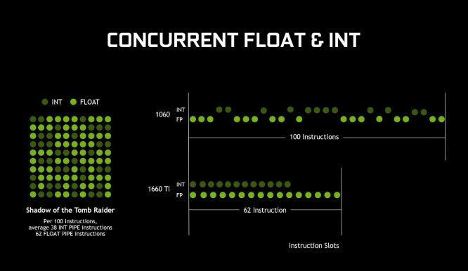 SM整數(shù)運算單元本身也擁有專屬指令發(fā)射端口,確保浮點運算單元和整數(shù)運算單元可以并行執(zhí)行任務(wù)。以下圖的《古墓麗影:暗影》游戲著色器為例,平均每100條浮點指令,就會伴隨38條整數(shù)流水指令和62條浮點流水指令。當(dāng)兩者并行執(zhí)行,指令吞吐率就會升高,游戲也會隨著提升。