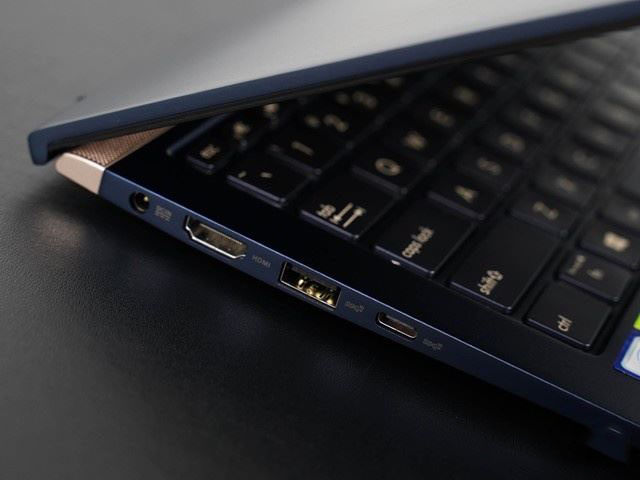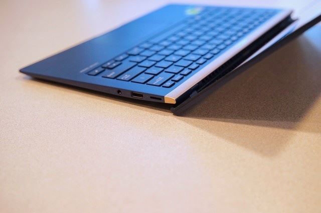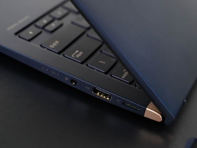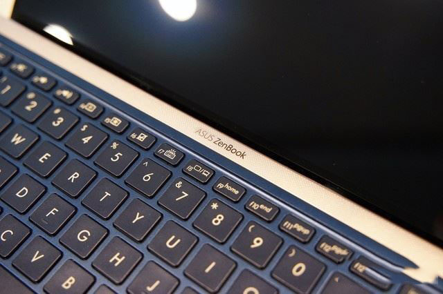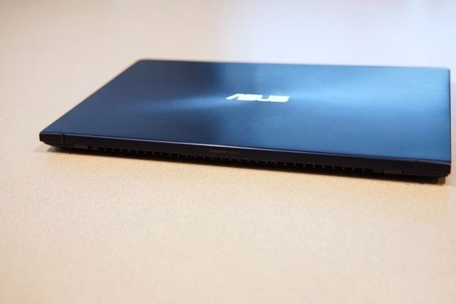 機(jī)身尾部,標(biāo)明了其ZENBOOK家族的身份。另外,尾部的兩側(cè)還有兩個(gè)凸起的腳墊,一方面能夠保證屏幕打開(kāi)后,將C面抬起的穩(wěn)定性,還能夠保護(hù)尾部不會(huì)與桌面接觸造成劃傷。另外,這兩個(gè)腳墊一直延伸到A面,即使A面倒扣在桌面上也不會(huì)讓整個(gè)金屬A面與桌面接觸,保護(hù)A面不會(huì)劃傷。