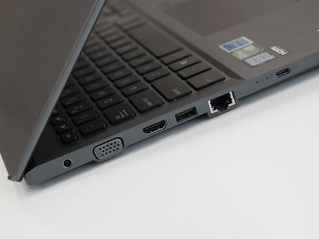 機身接口的數量與布局是商務電腦必須要看重的,華碩PX574F的接口表現非常亮眼,我們可以看到機身左側不僅帶有常見的HDMI、USB3.1gen1、RJ45網線以及Type-C接口,甚至還提供了VGA視頻接口,這在目前的筆記本市場已經非常罕見了,但很多仍舊在使用老款投影儀、顯示器等顯示設備的辦公場景仍舊需要VGA的支持。