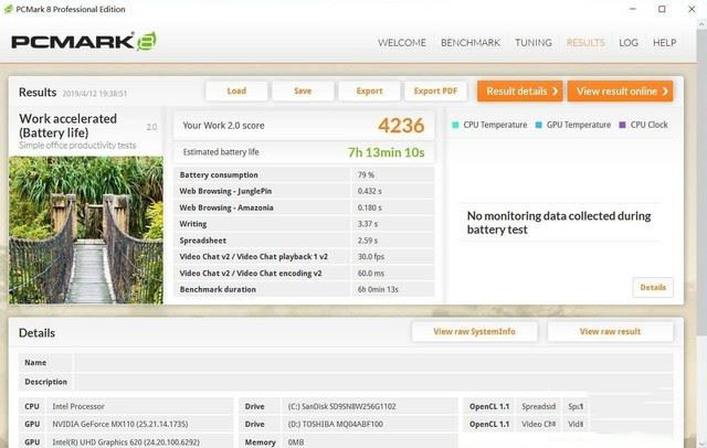 雖然是一臺帶有獨顯的大屏商務筆記本,但華碩PX574F的續航表現缺驚人的強大。在PCMARK 8的Work模式測試下,華碩PX574F得到了長達7小時13分鐘的成績,相比于主流輕薄本3-4小時的測試結果華碩PX574F領先了一倍左右,在實際的使用中幾乎可以滿足兩個工作日的使用,非常亮眼。
