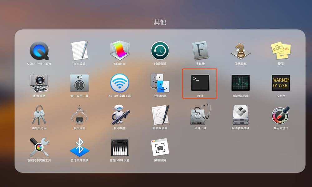 1、打開屏幕左下方的”終端“或者在”Launchpad“中找到”其他“->"終端"。