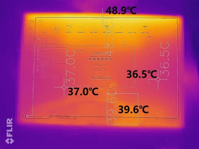 由于亮度和對比度均有提升,功耗和發熱不可避免要被考慮進來。Surface Studio 2的使用場景包含了放倒后手部和屏幕直接接觸的情況,所以我也用紅外熱成像拍攝了它的屏幕在100%亮度下長時間工作后的熱量分布圖,可以看到Surface Studio 2屏幕的熱量集中在屏幕最上端這種人手基本不會觸碰的地方,其余區域都接近人體體溫,短時間使用是不會有明顯不適,但用久了手汗會成為麻煩,對油性皮膚用戶來說尤其如此。