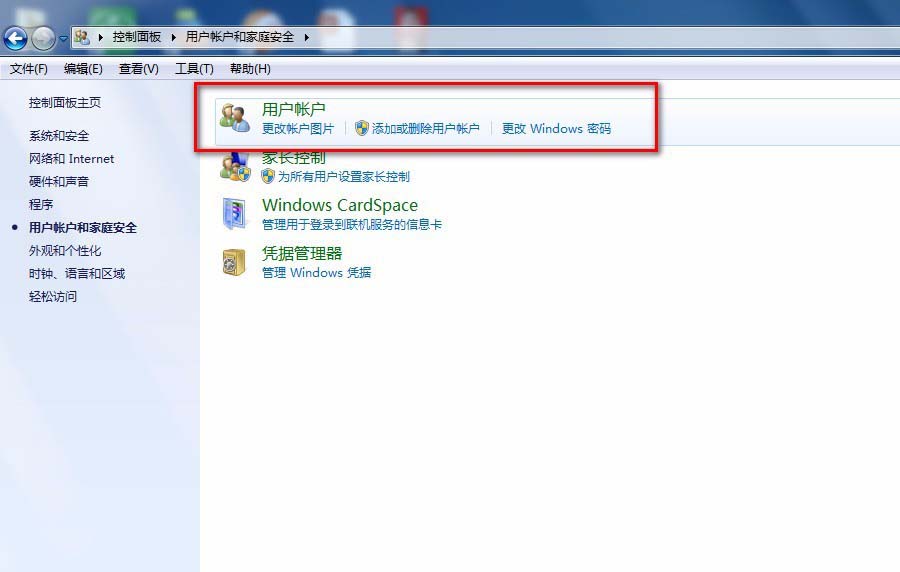 3、在“用戶帳戶和家庭安全”里面點擊“用戶帳戶”進入。