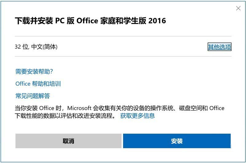 (2) 選擇“32位,中文(簡體)”,點擊“安裝”,下載并運行安裝包,完成 Office 的安裝。
