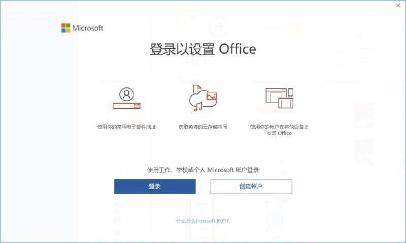 2、以 Word 應用為例,打開 Word 應用后,會彈出“登錄以設置Office”的界面,如果您有微軟帳戶,直接點擊“登錄”;如果沒有微軟帳戶,點擊“創(chuàng)建帳戶”并按照提示注冊一個。