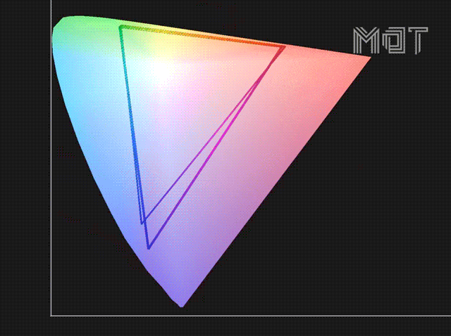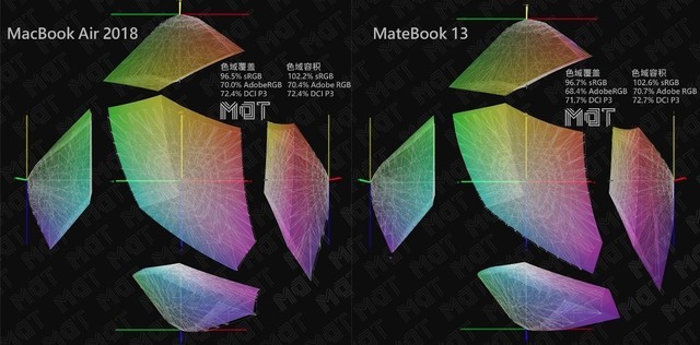 左側的 MacBook Air 2018 與右側 MateBook 13在設計之初均為 sRGB 覆蓋,在實測中忽略測量誤差也屬于能覆蓋全部 sRGB 的級別,因此它們在色彩鮮艷的程度上基本沒有區別,覆蓋 sRGB 也能讓它們在日常的觀影娛樂和非印刷用途的修圖、視頻編輯中得到很好的體驗。