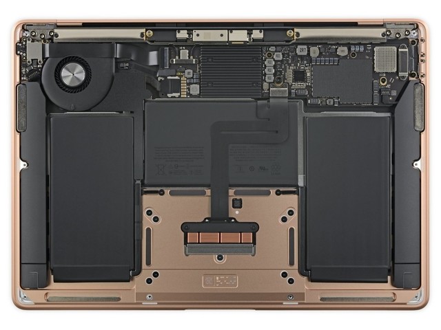 雖然這一次 MacBook Air 選擇的是 TDP 較低的 i5-8120Y 系列處理器,但依然配備了一個小型風扇了輔助散熱,不過由于內部空間的限制,并沒有任何熱管設計,這樣一來風扇也就不能直接為 CPU 降溫,只能起到改善內部空氣循環的效果,這也為后期散熱造成了一定影響。