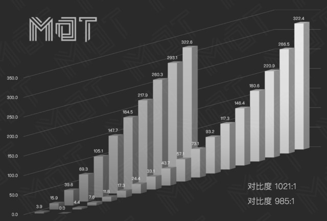 在我們的測試中,兩者的屏幕都屬于 300cd/m2 級別,左側 MateBook 13 和右側 MacBook Air 2018 的最高亮度都在 322 cd/m2 左右,面對室內使用都已經足夠,主要區別還是 MacBook Air 與其他 Mac 一樣,擁有更多快捷亮度調節級別,以及最低亮度時會直接關閉屏幕。而對比度方面,兩者也都同為 1000:1 的較高水準, 也就是說明暗對比較為突出,文字銳利看電影時上下都不會有明顯灰邊存在。