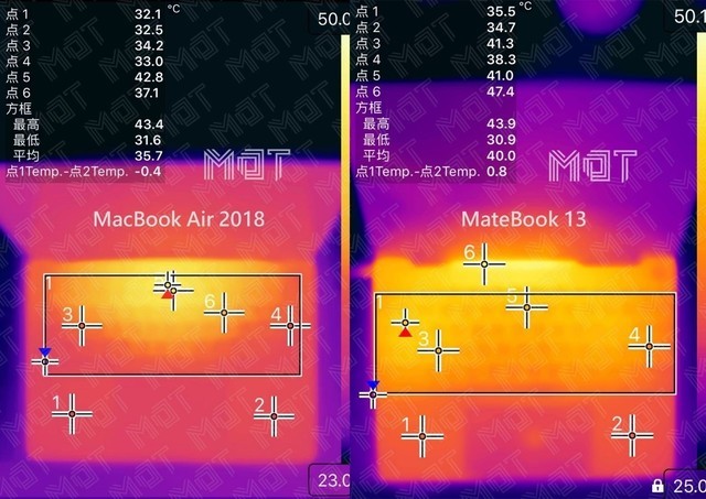 由于內部散熱設計存在著巨大不同,MateBoko 13 和 MacBook Air 2018 的表面溫度差距本應會有較大區別,但實際上由于不同的溫度控制策略和處理器 TDP,所以兩者的表面最高溫差距并不大。