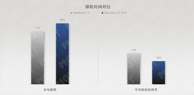 比如本地 1080P 視頻播放測試中 MacBook Air 2018 能夠堅持差不多15 小時,而 MateBook 13 則是接近 13 小時,差距 15.2%。在日常網頁瀏覽的續航測試中 MateBook 13由于電池供電時會控制功耗,并且屏幕分辨率相對更低,所以續航反而更高,達到了 7 個半小時的成績,而 MacBook Air 2018 吃了沒有功耗控制的虧,以 5 個半小時多不到 6 小的成績超比 MateBook 13 少了 32% 左右。