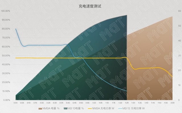 在充電速度方面,MateBook 13 在前期能夠以短暫超過 50W 的功率充電,隨后 60% 之前都可以保證 40W 左右的充電功率,因此一共需要 1 小時 25 分鐘完成 5%~95% 充電。而 MacBook Air 2018 由于默認附送的充電器只有 30W, 所以最高充電功率則是 28W,整機充電速度并不是很理想,一共需要 2 個小時才能從 5% 充至 95%, 差距比較大。