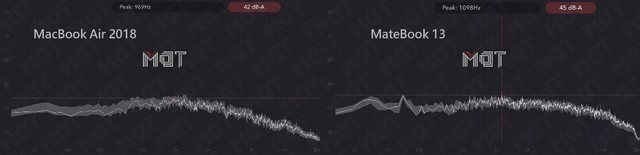 在極限風扇轉速下,由于 MacBook Air 只有單風扇,而且內部風道較為封閉,盡管其風扇轉速也達到了 8000 轉每分鐘級別,但總的噪音還是會比 MateBook 13 這樣的雙風扇設計小一些,一個是 42dBA 而另一個是 45dBA。兩者都沒有明顯的單一頻率異音存在,因此而舒適度方面都有比較好的表現,聽到的聲音主要都是呼呼的風聲而不是高頻異音。