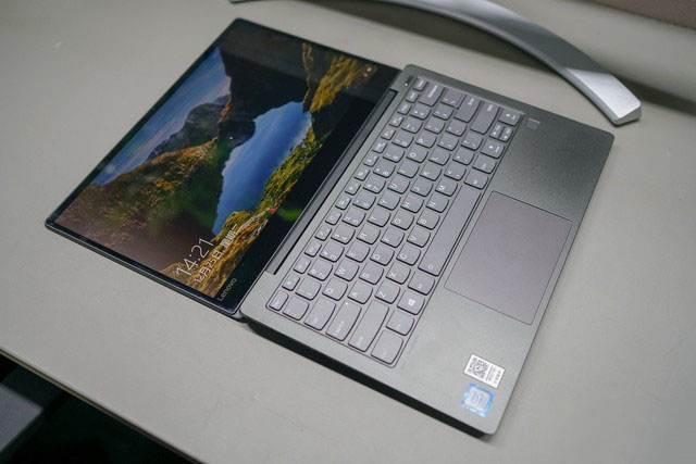 然后我們將機身展開,可以看到聯想小新Air 13采用了三邊窄邊框設計,最窄處僅6.25mm,屏占比高達80%。屏幕面為一體式鏡面玻璃,顯示效果清晰靚麗,具有撲面而來的通透感,迥異于市面常見的霧面屏。