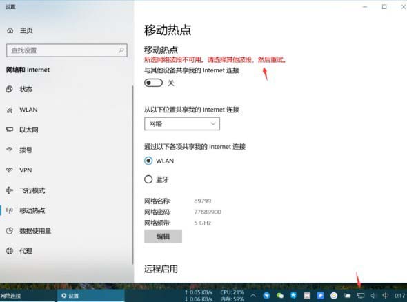 不過最近在使用這個功能的時候,卻遇到了這樣一個問題,盡管最新的Windows 10版本已經內置了創建無線熱點的功能,但是因為不是經常使用,并沒有發現在連接有線網絡的情況下,默認只能創建2.4GHz網絡的熱點,沒有辦法開啟5GHz網絡的熱點(可能與我電腦的無線網卡有關,型號是intel AC8265,實際上是支持連接5GHz的熱點的),會一直報錯,提示網絡頻段不可用。