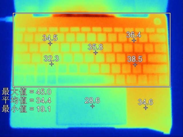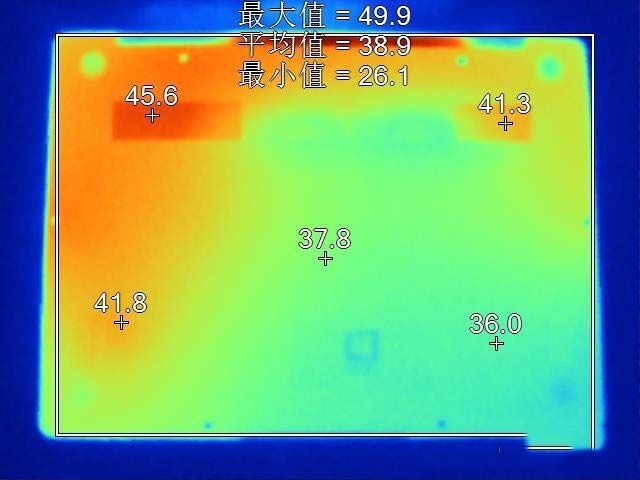 再看外部溫度。從我的實際感受來看,因為HUAWEI MateBook 13全金屬的機身緣故,所以熱傳遞比較平均,從熱成像儀的測試結果來看,其實表面平均溫度并不高,C面平均34.4℃、D面平均38.9℃,都低于均值42℃的業界標準溫度。