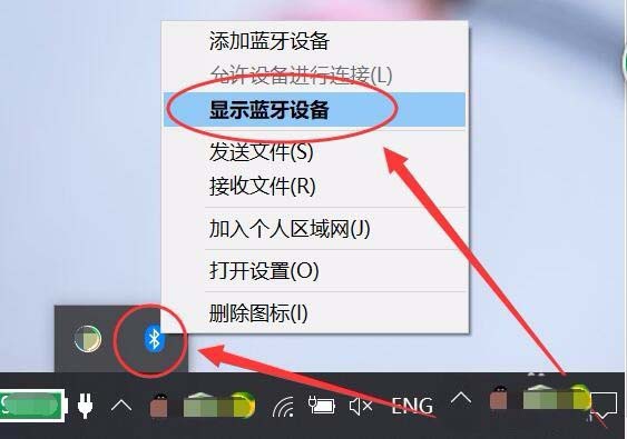 9、任務欄上找到藍牙圖標,右擊后選擇顯示藍牙設備選項。