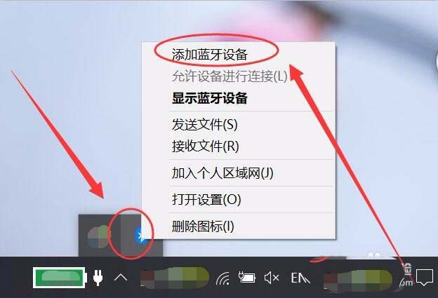 4、藍牙功能打開后,在任務欄找到藍牙圖標,右擊后選擇添加藍牙設備選項。