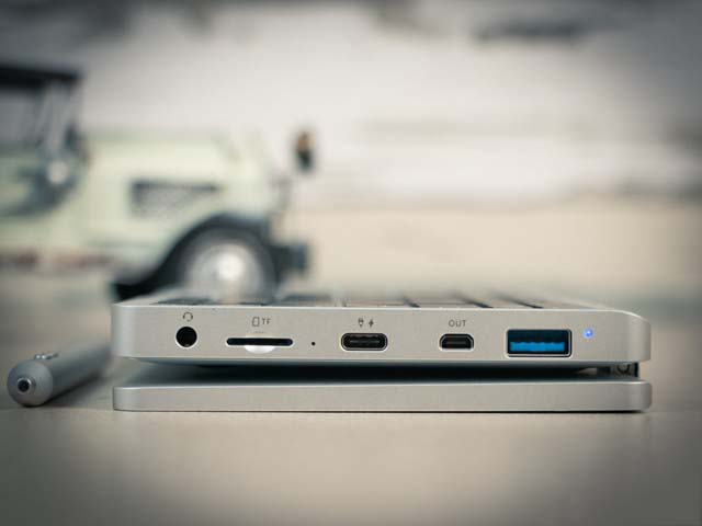 可能有用戶會認為這么小的筆記本電腦它的擴展性一定比較差。當然,7英寸機身的擴展能力畢竟不如大尺寸筆記本電腦來的強,不過壹號本OneMix 2S也沒有做哪種單單放兩個TYPE-C了事的事情。而是在機身右側配置了1個標準的USB 3.0 TYPE-A、1個Mini HDMI接口、1個支持數據傳輸和充電的USB TYPE-C接口,1個TF卡槽,以及3.5mm耳機麥插孔。能夠基本滿足商務用戶的擴展需求。