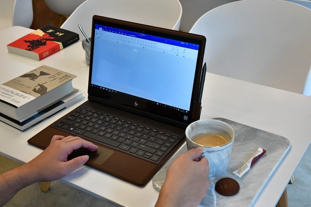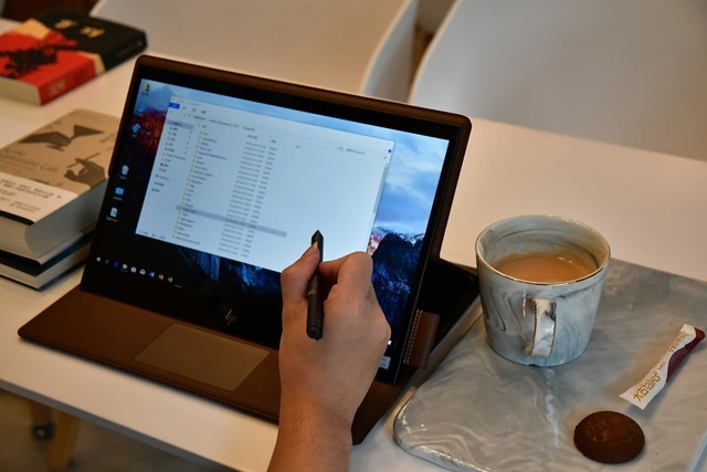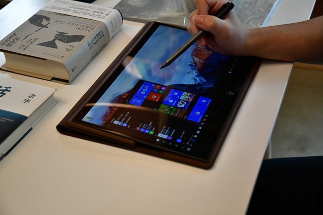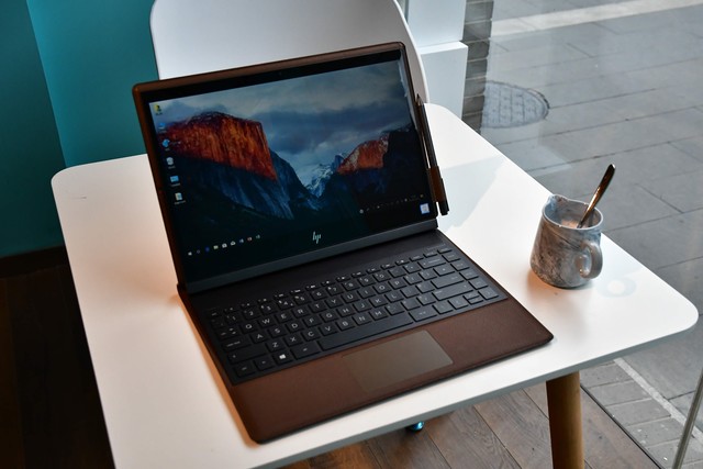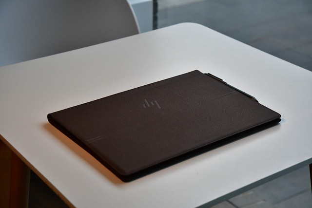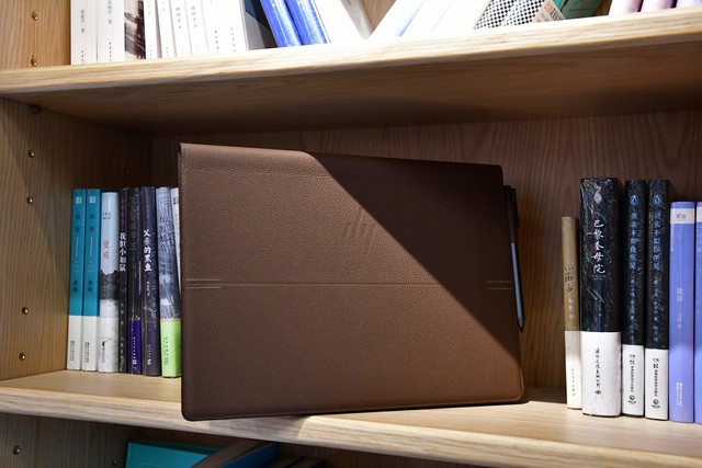 屏幕采用康寧大猩猩鏡面玻璃覆蓋的13.3英寸微邊框屏幕,息屏狀態(tài)下渾然一體,底部是亮銀鍍鉻的新版HP斜杠LOGO。右側(cè)有一個(gè)放置手寫(xiě)筆的筆架,同樣采用了牛皮材質(zhì),并做了縫線處理。
