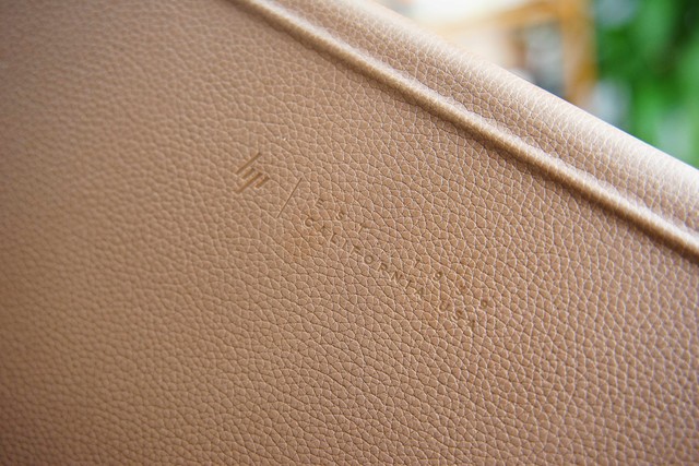 而在A面你可以看到中部有一條細(xì)折線,是屏幕部分轉(zhuǎn)軸的對(duì)應(yīng)位置。而在細(xì)線兩側(cè),惠普做了縫線的處理,擁有一種純手工打造的精致感,個(gè)人覺(jué)得這是A面設(shè)計(jì)的點(diǎn)睛之筆。A面的惠普LOGO采用陰文壓印工藝,就像是皮質(zhì)記事本封面的文字一樣。