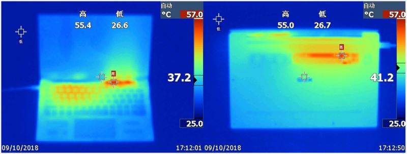 我們使用 AIDA 64進行滿載測試,連續(xù)烤機1小時后我們使用熱成像儀對筆記本溫度進行檢測,從圖中我們可以看出,在滿載情況下,主要溫度都集中在筆記本散熱風扇出風口處。