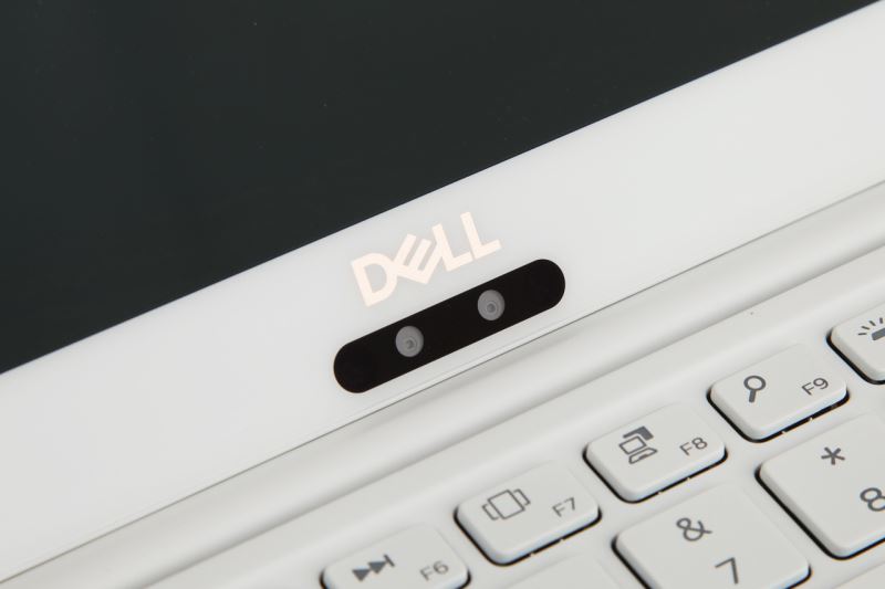 由于窄邊框的設計,戴爾的LOGO以及Windows Hello人臉識別模塊被放置在了屏幕下側靠近轉軸的位置。