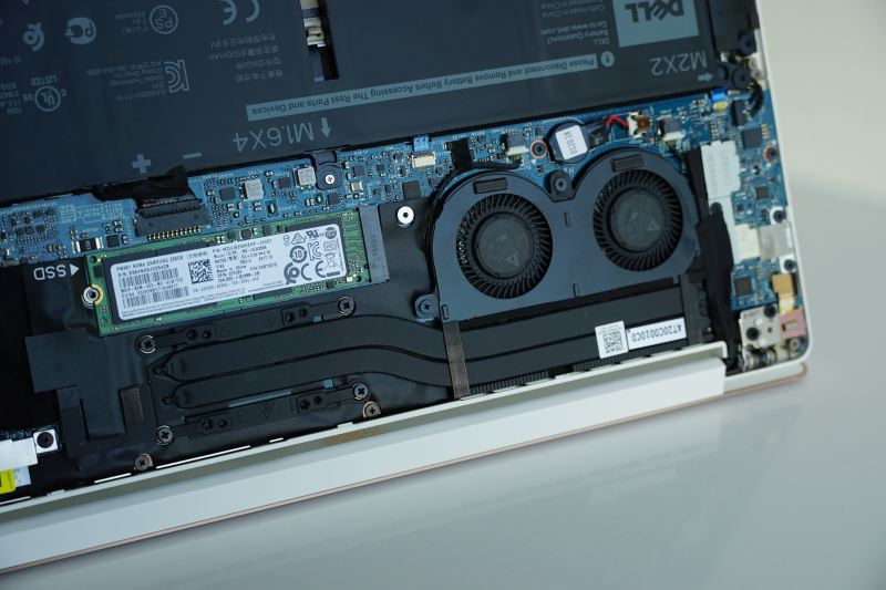 我們拆下XPS 13的底蓋后可以一覽機身內的硬件全貌,作為輕薄本產品,XPS 13為用戶預留的升級空間有限,多數(shù)硬件采用了板載,只有機身上這塊固態(tài)硬盤可以進行更換升級操作,不過鑒于這是一款僅有11.6mm厚度的輕薄本產品,板載大多數(shù)硬件這種情況是可以理解的。