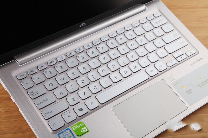 冰鉆金配色的筆記本C面采用了金屬拉絲的表面設計,有著美觀的視覺效果的同時為用戶帶來了優秀的觸覺體驗,銀色的鍵盤按鍵采用1.4mm鍵程設計,搭配被A面頂起的2.47°的傾斜面,輸入體驗良好。