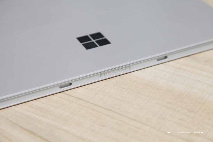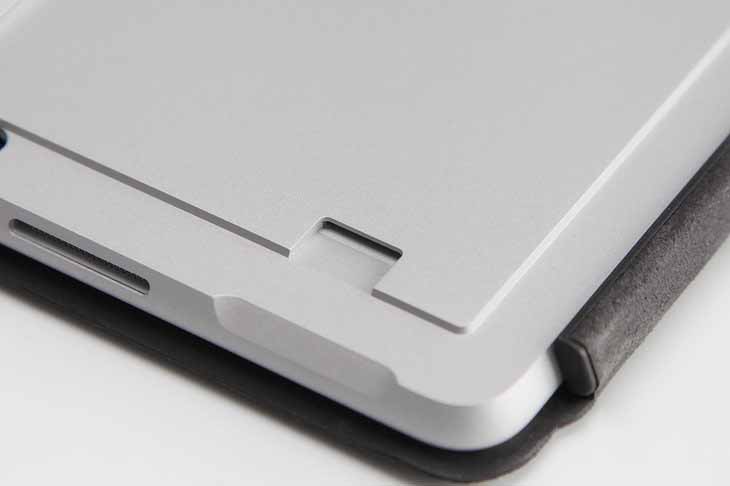 在背面最下沿配備有Surface 專業鍵盤蓋端口,采用磁吸設計,同時還有兩個卡扣槽,與鍵盤上工程塑料材質的卡扣相契合,可有效固定鍵盤,防止在使用中的脫落。