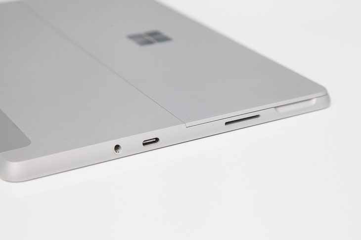 Surface Go的機身接口主要分布在機身左側、下方以及支架下,按鍵分布在機身上方的右側。