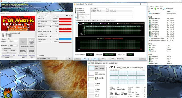 另外散熱模組也非常夸張,糾結有幾根熱管已經沒有意義了,因為根本數不清楚。實測雙拷狀態下,處理器功耗在68W左右,溫度最高81°,顯卡頻率為1835MHz,最高溫度71°。這樣的成績對于i7-8700K和GTX1080來說,已經算是非常優秀了。