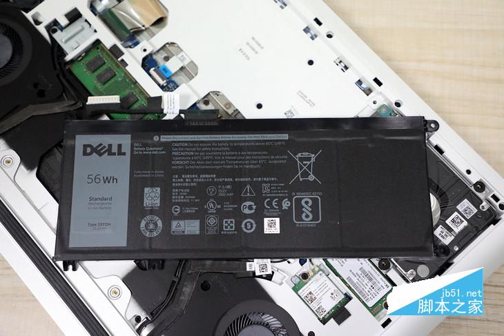 我們依次拆下機身上的主要部件,首先要拆下的是這塊容量為56Wh的電池,戴爾G7支持快速充電技術,在接通電源后可以快速充滿電池,讓電腦保持隨時可以“戰斗”的狀態。