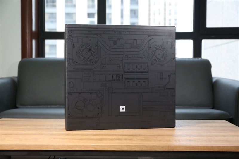 包裝盒正面有小米的LOGO,背景畫面是小米游戲本內部結構圖,看上去非常霸道。