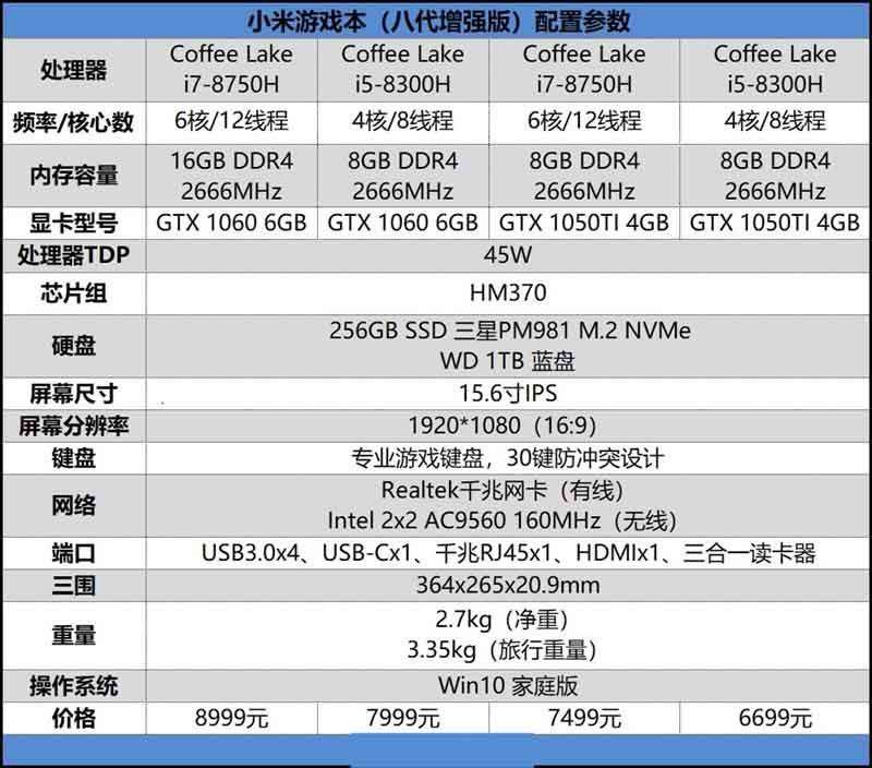 這次小米同樣也發布了四款不同配置的機型。我們收到的型號是G58725D6D/CN,屬于小米游戲本八代增強版的頂配版本,配置為i7-8750H處理器、雙通道16GB DDR4 2666MHz內存、顯卡為GTX1060 6GB。升級后的頂配版依然保持了8999元的價格。