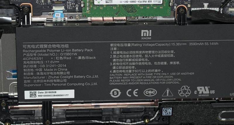 左邊居中是Intel AC9560無線網卡,2T2R雙通道雙天線設計。頻率為160MHz,最高速率1.73Gbps。無線網卡還內置了藍牙5.0模塊。