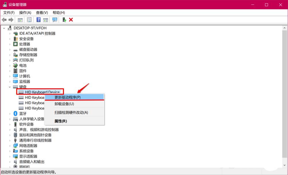 第一步:進入設備管理器,更新鍵盤驅動程序。