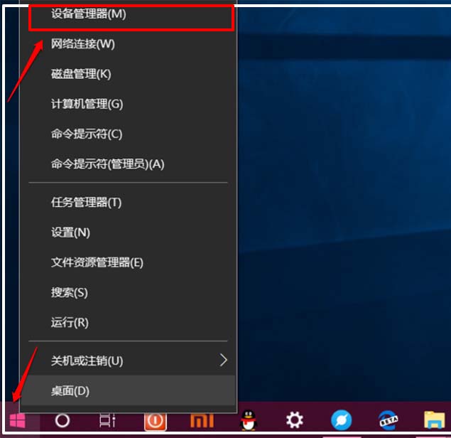 1、右鍵點擊系統桌面左下角的【開始】,在右鍵菜單中點擊【設備管理器】;