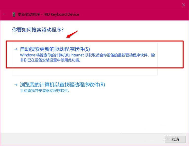4、在更新驅動程序:HID Keybord Device 窗口中,點擊:自動搜索更新的驅動程序軟件;