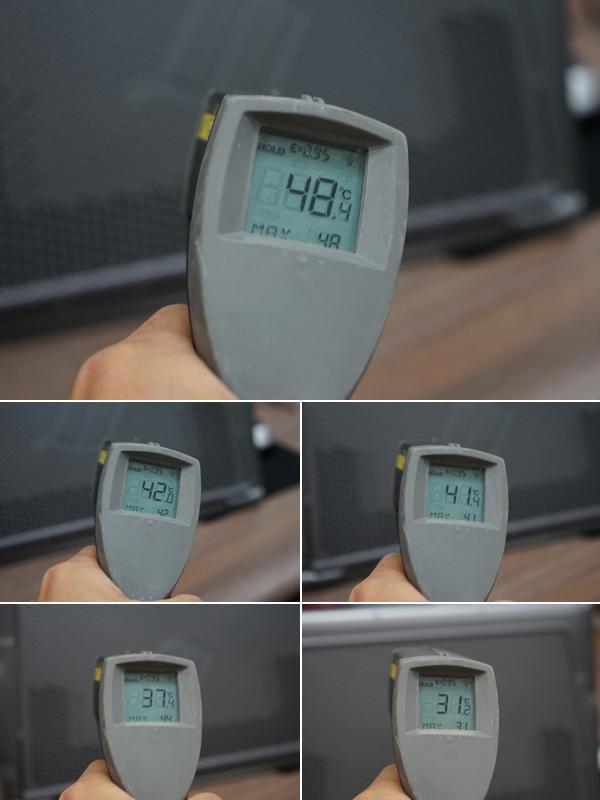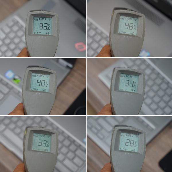 溫度和噪音的控制能力決定了游戲本的好壞,因此對溫度長時間的控制,以及在溫度持續上升時不降頻,才是游戲本的核心競爭力。三星玄龍騎士Z持續運行3D游戲1小時后,使用紅外溫度計測量電腦各部位的發熱狀態。測量結果顯示,C面前端的熱量集中在中間部位,溫度在48度左右,左側約33.8度,右側約31.4度。