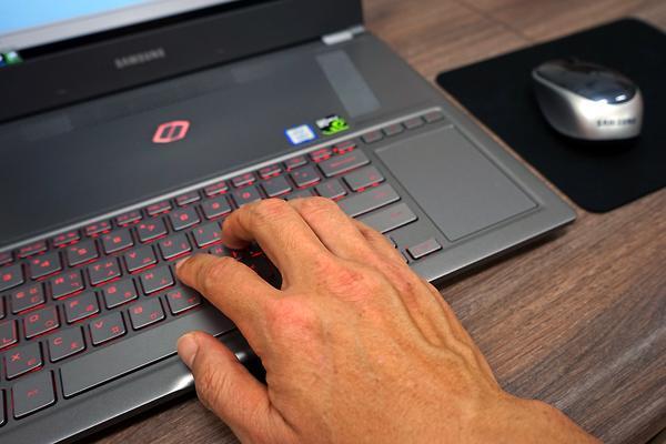 三星玄龍騎士Z的鍵帽表面如鵝卵石般順滑,給人愉快的輸入體驗。鍵盤上的背光燈仍然是玄龍騎士Z的基本配置,紅色的LED背光燈,彰顯出游戲本特有的震撼。