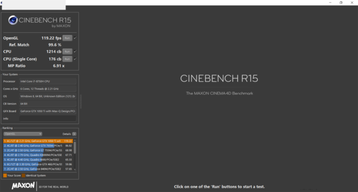 在Cine Bench R15的測試中,單線程分數為176cb,多線程分數為1214cb,相較于同樣采用了i7-8750H處理器的其它產品性能要高出不少,基本上可以滿足大部分主流圖形處理工作和沙盒類游戲需求。