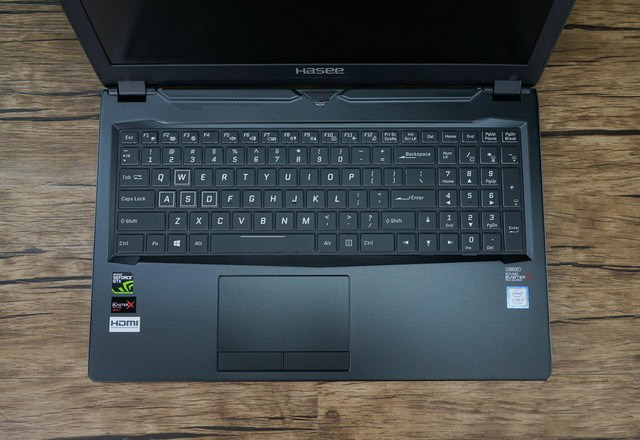 神舟精盾T96E的C面采用了多棱角的造型,尤其是鍵盤的邊框頗具游戲氣息,金屬材質帶來的質感也很明顯,很有檔次。神舟精盾T96E的鍵盤手感優良,鍵程表現良好具有確認感,觸控板的手感也比較順滑,兩個非隱藏式的左右鍵手感遠遠好于輕薄本的隱藏式按鍵,在“輸入外設”的表現上神舟精盾T96E是合格的。
