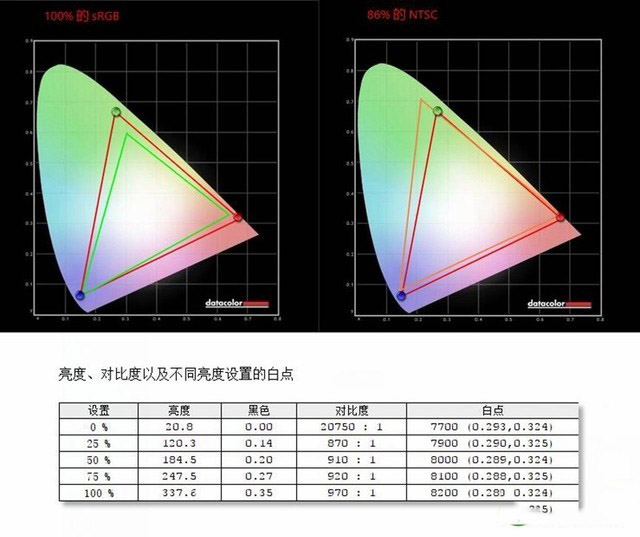 神舟精盾T96E選用了一塊120Hz刷新率的15.6英寸屏幕,根據實際觀感來看應該是TN材質,這塊屏幕擁有實測高達100%sRGB和86%NTSC的色域,Adobe RGB色域則達到了89%,而亮度達到了338尼特,對比度970:1,色溫平均為8000K的冷色調,存在明顯的色溫偏移。總的來說這塊屏幕的素質是比較不錯了,高素質的TN面板同樣有良好的表現。